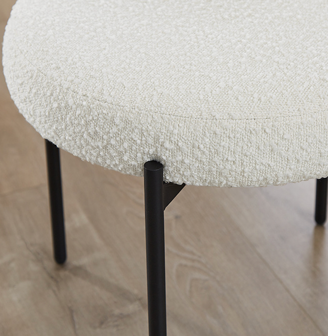 - Chất liệu: khung kim loại sơn đen mờ, đệm ngồi và tựa lưng bọc vải lông cừu